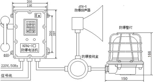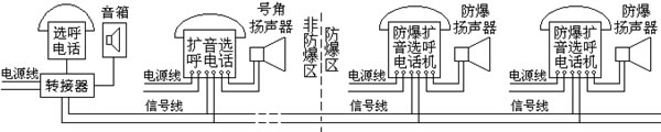 該系統(tǒng)為無主機防爆擴音對講系統(tǒng),不需要傳統(tǒng)的主機,系統(tǒng)內(nèi)的防爆電話站由HZBQ—3A型防爆擴音對講選呼電話機和dYH—5型防爆揚聲器(防爆喇叭)等組成。兩個以上話站連接即可構(gòu)成生產(chǎn)調(diào)度系統(tǒng)。所有的防爆話站均并聯(lián)到兩根信號總線上。拿起防爆話站的手柄按被叫號碼,即啟動被叫話站的功放電路,通過被叫話站的揚聲器進行廣播呼叫?珊艚腥我庖徊吭捳,或某一組話站,或全部話站,實現(xiàn)單呼、分組呼叫和全部呼叫功能,實現(xiàn)分級調(diào)度。該擴音對講系統(tǒng)采用兩芯信號總線傳輸,由交流電源供電。防爆等級有ⅡBT6和ⅡCT6兩種。該擴音對講系統(tǒng)具有使用簡單,安裝和維修方便,通話效果好,擴音功率大,性能價格比高,應(yīng)用范圍廣等優(yōu)點。適用于空間大,環(huán)境嘈雜,崗位分散的場所,用于生產(chǎn)調(diào)度和聯(lián)絡(luò)通訊。