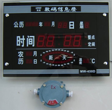 該防爆數(shù)字鐘(數(shù)碼信息萬年歷)采用先進的集成電路制成的防爆本質(zhì)安全型數(shù)字萬年歷,供電經(jīng)BKZ-1型防爆轉(zhuǎn)接器接入220V交流電源。該防爆數(shù)字鐘為壁掛式,適用于含有易燃易爆氣體混合物的場所,如石油、化工、油庫、鋼鐵、焦化、礦山等企業(yè)。